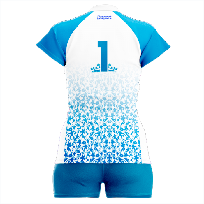 Жіноча волейбольна форма в біло-блакитному дизайні — стильне та функціональне рішення для команди. Комплект складається з ігрової футболки та шортів, виконаних у поєднанні білого та насиченого блакитного кольорів із декоративним градієнтним принтом у нижній частині.